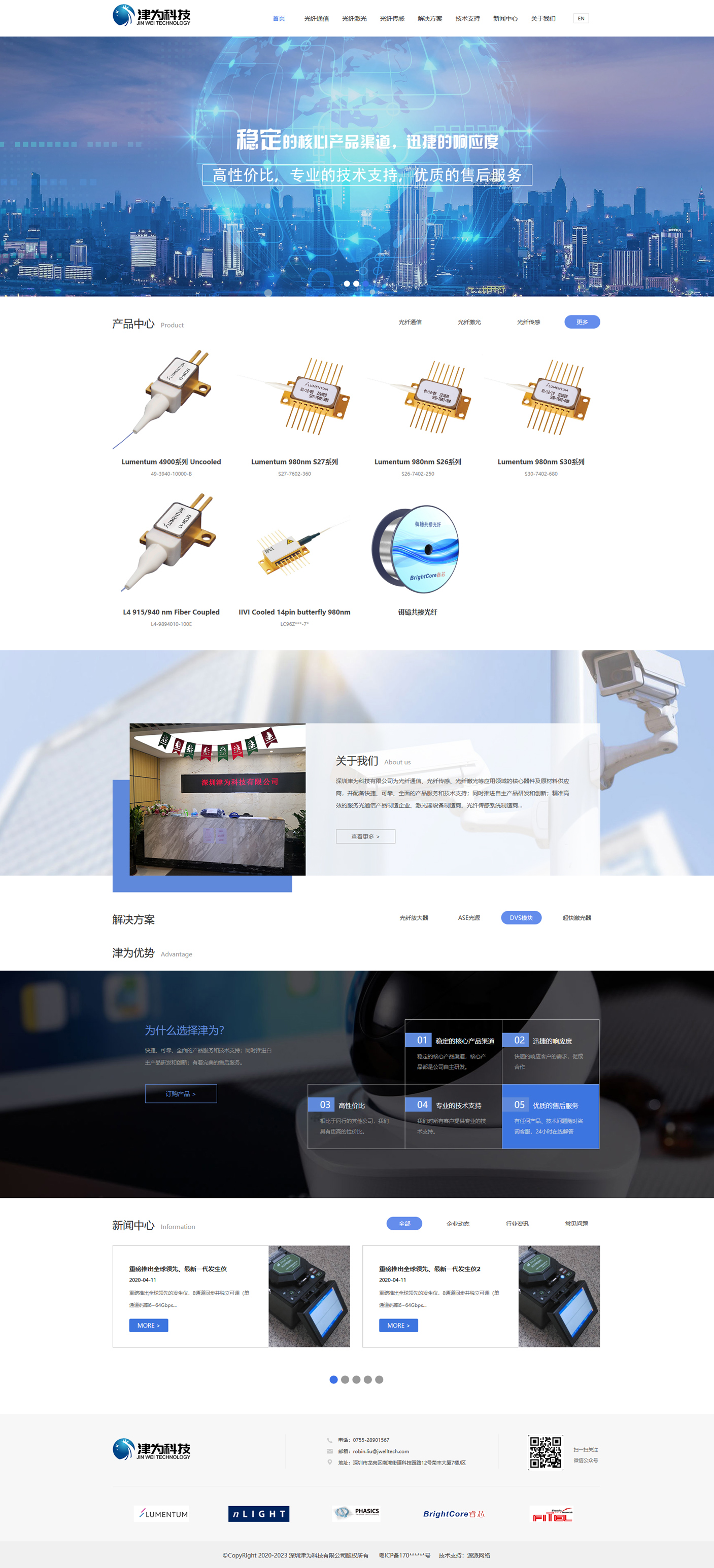 結(jié)合津?yàn)榭萍糽ogo元素將網(wǎng)站設(shè)計(jì)主題色定位為藍(lán)色,通過(guò)深灰及白色襯托整體的科技感。