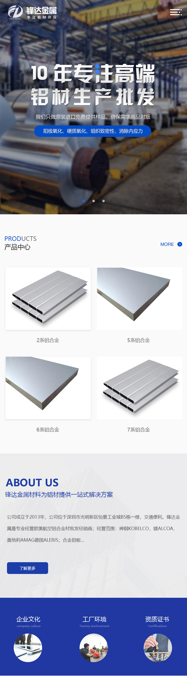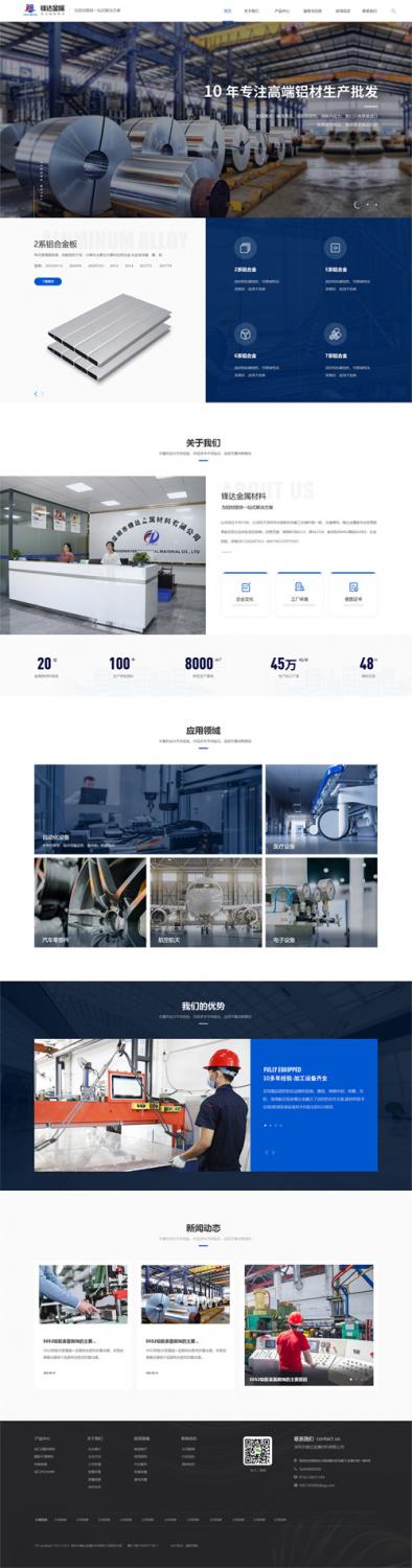 結(jié)合鋒達(dá)金屬的品牌元素和鋁材網(wǎng)站設(shè)計的風(fēng)格,整站采用了科技藍(lán)作為為主題色,網(wǎng)站風(fēng)格簡約厚重而不失科技感,符合鋁材網(wǎng)站制作行業(yè)特征及品牌的調(diào)性。